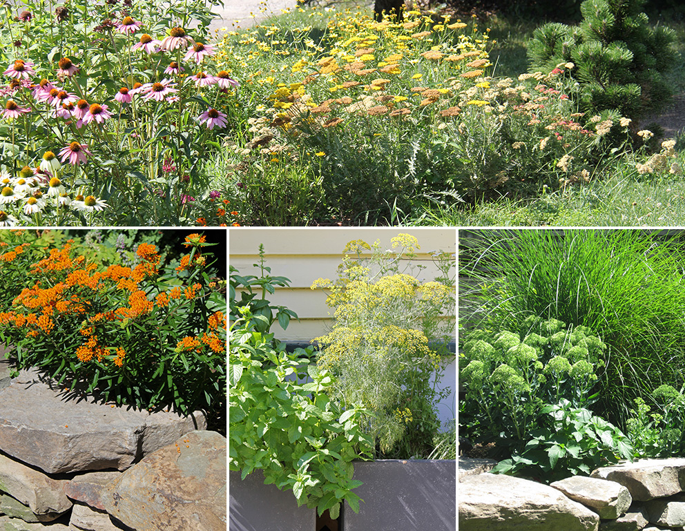 For the front garden (upper image) we removed an area of lawn and planted an exuberant mix of perennial sun plants including Coneflower, Yarrow, Coreopsis, Bee Balm, Poppies and Salvia anchored by several small mugo pines. To complement a new stone driveway we added Amelanchiers, Crabapples and a containerized herb garden (lower middle image) with dill, basil, rosemary and mints.